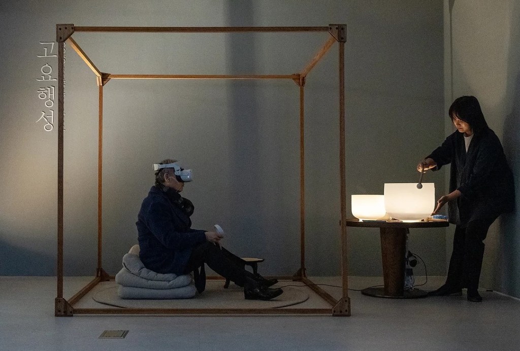 ‘경행 – 경행은 동양의 오랜 수행법 중 하나로, 고요하고 천천히 걷는 행위를 통해 내면의 평화를 찾아가는 명상입니다. 고요행성에서는 VR의 환경에 수동적으로 참여하는 것이 아니라, 신체는 앉아 있지만 실제 움직임을 상상하며 이후 실제의 삶에서도 몸의 감각을 기억하고, 관심을 기울일 수 있도록, 그리고 실제 명상을 할 수 있도록, 장면, 공간, 가이드 상의 여백을 두고 그 여백을 참가자가 채울 수 있도록 안내합니다.’